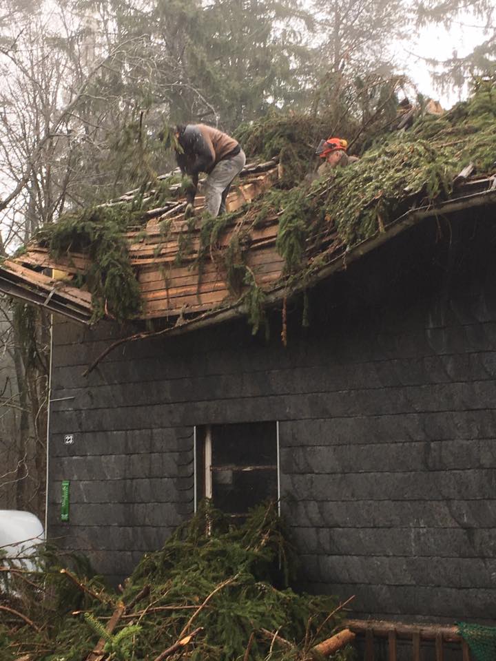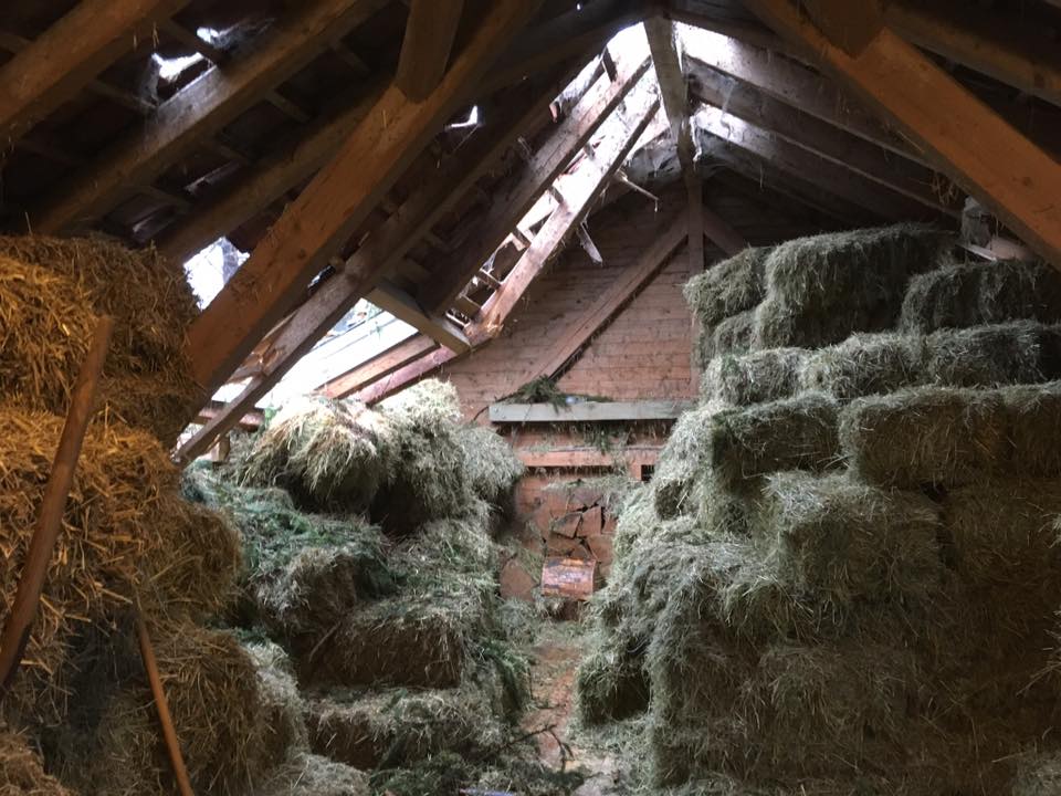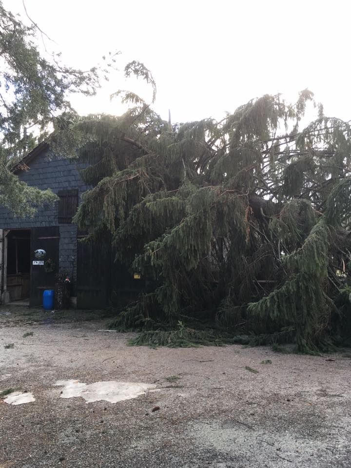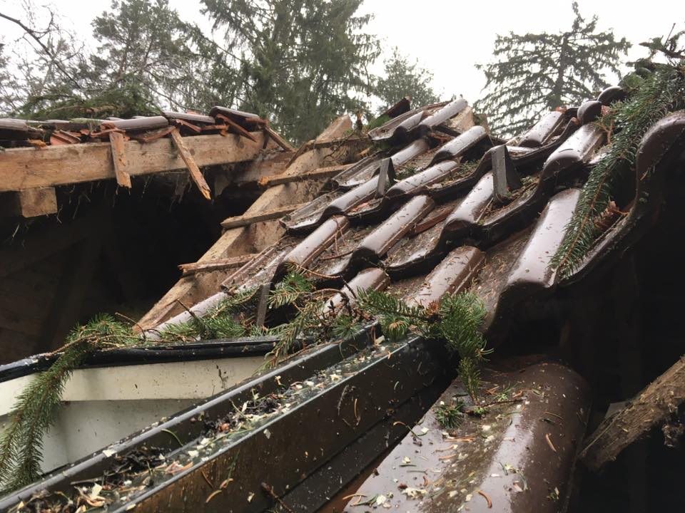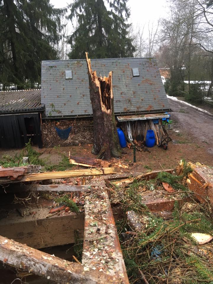 Sturm Burglinde ist auch bei uns nicht ohne Schaden vorüber gezogen. Eine alte Fichte konnte dem Sturm nicht Stand halten und wurde auf den Pferdestall geworfen. Zum Glück sind wir und die Pferde mit dem Schrecken davon gekommen. Aber das Dach des Stalles hat großen Schaden genommen. Danke allen, die bei den Aufräumarbeiten mitgeholfen haben.